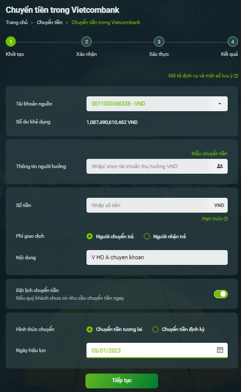 để đặt lịch chuyển tiền - - Chọn hình thức chuyển tiền là Chuyển tiền tương lai