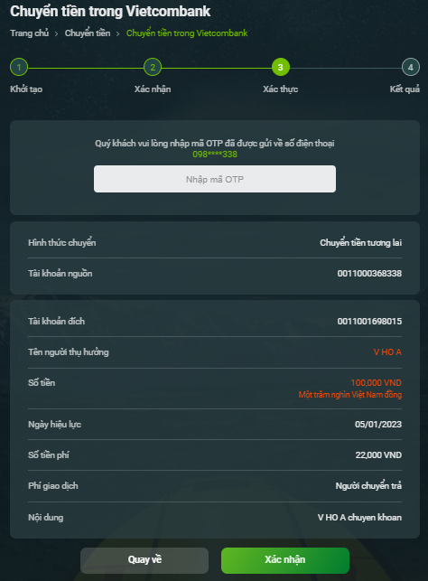 - Xác thực bằng VCB - Smart OTP: KH nhập mật khẩu VCB-Smart OTP, hệ thống tự động sinh mã xác thực giao dịch