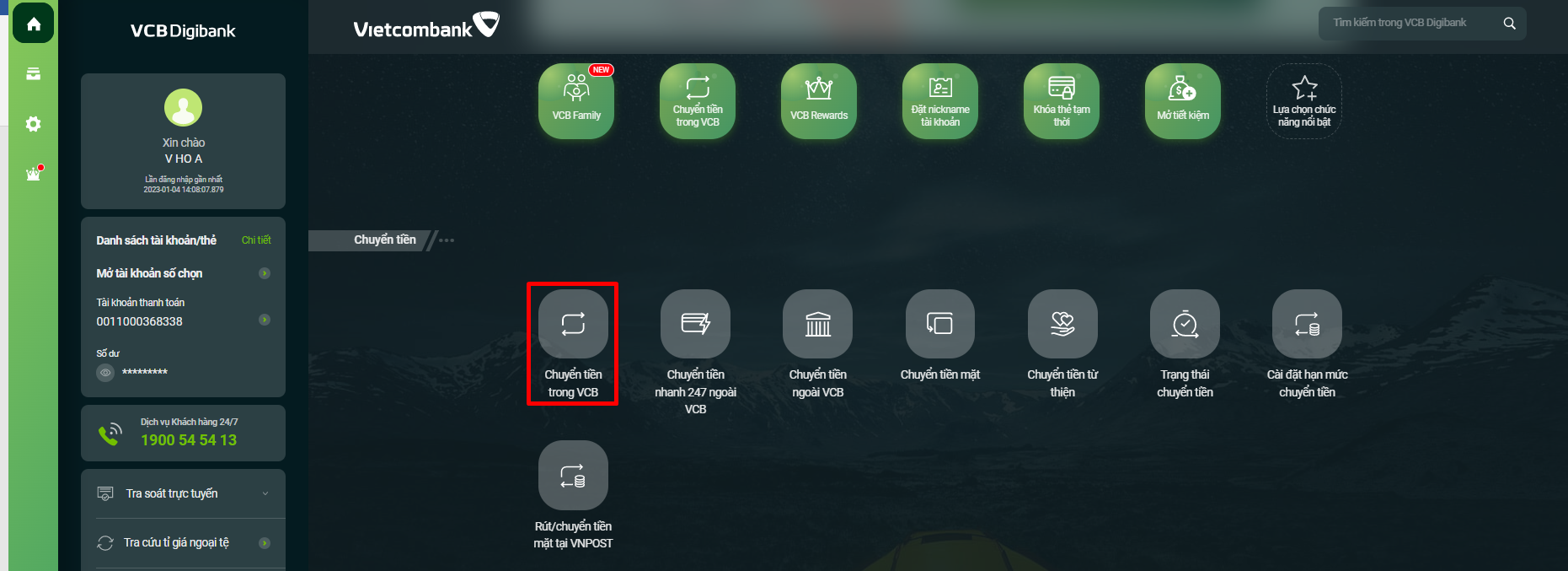 ‘Chuyển tiền trong VCB’ từ nhóm Chuyển tiền: