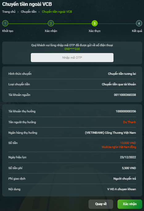 - Xác thực bằng VCB - Smart OTP: KH nhập mật khẩu VCB-Smart OTP, hệ thống tự động sinh mã xác thực giao dịch