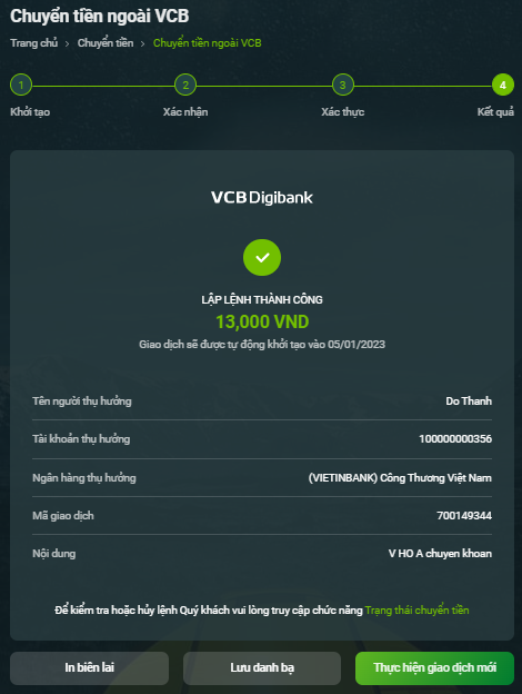 - Lưu danh bạ: để lưu thông tin người thụ hưởng. Nút này chỉ hiển thị đối với người nhận chưa được lưu danh bạ thụ hưởng.