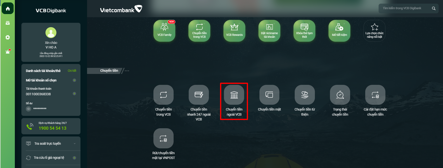 ‘Chuyển tiền ngoài VCB’ từ nhóm Chuyển tiền: