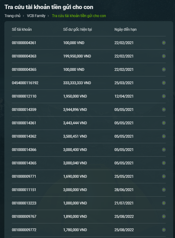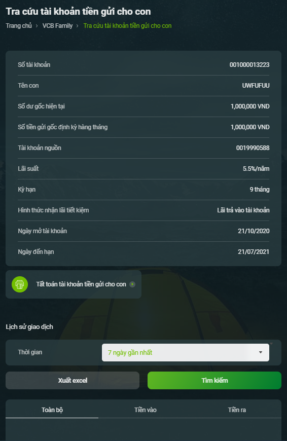 Khách hàng đến chức năng theo thao tác: Tiền gửi cho con > Tra cứu tài khoản tiền gửi cho con