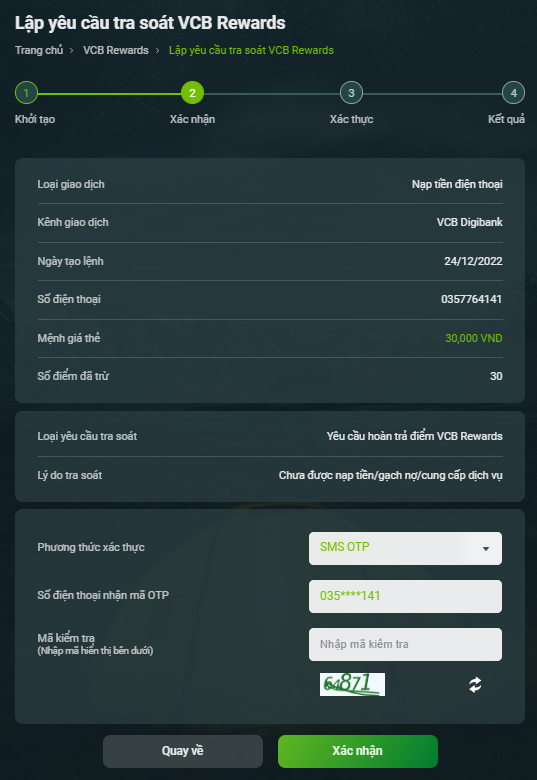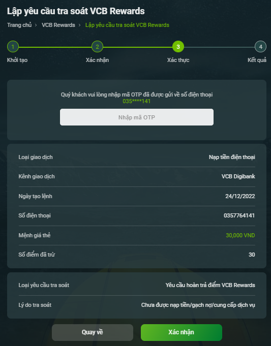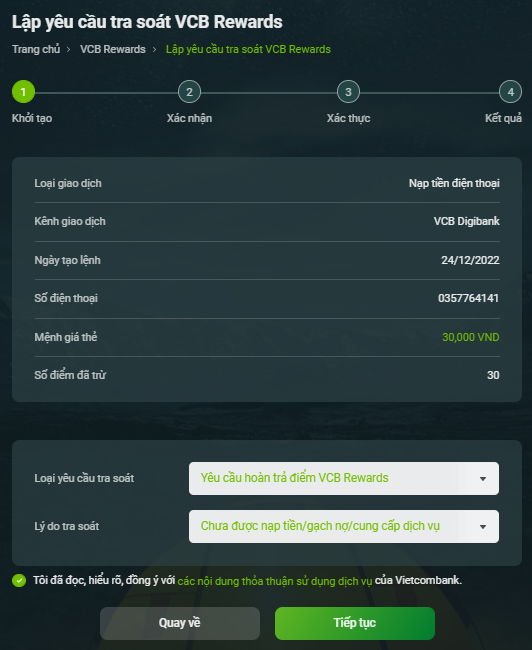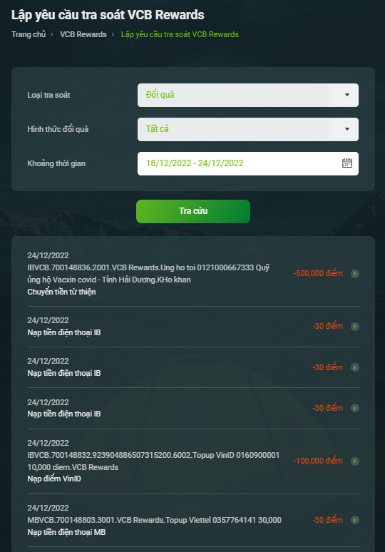 Bước 1: Chọn giao dịch cần Tra soát VCB Rewards
