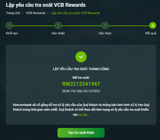 - - Nhấn chọn Tạo tra soát khác: để quay về màn hình lập yêu cầu tra soát.