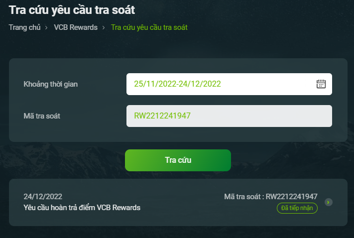 - Chọn Tra soát VCB rewards > Tra cứu yêu cầu tra soát VCB Rewards