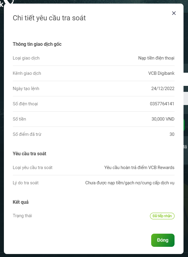 - Kiểm tra thông tin đã yêu cầu tra soát đã lập và kết quả xử lý yêu cầu tra soát của ngân hàng (nếu có)