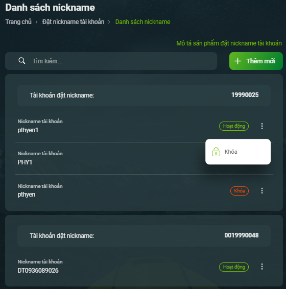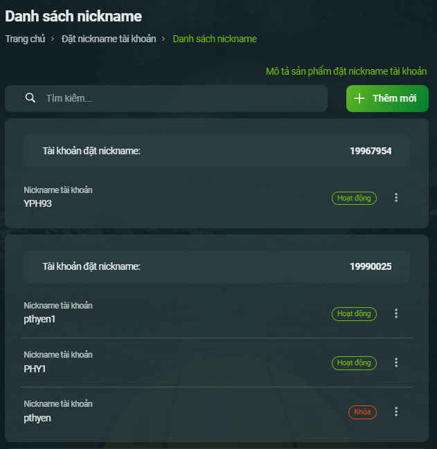 - - Hệ thống hiển thị danh sách nickname theo tài khoản của KH