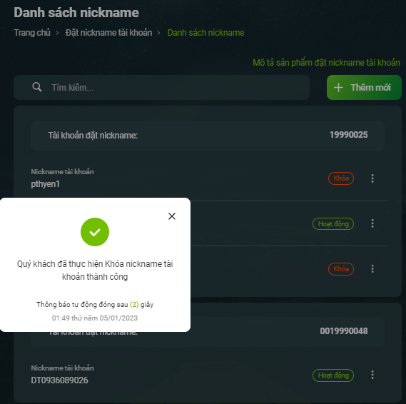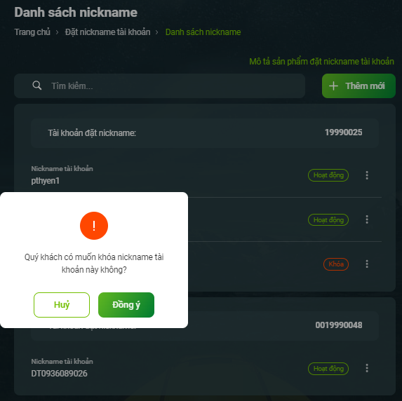 Hiển thị popup xác nhận có muốn khóa nickname tài khoản: