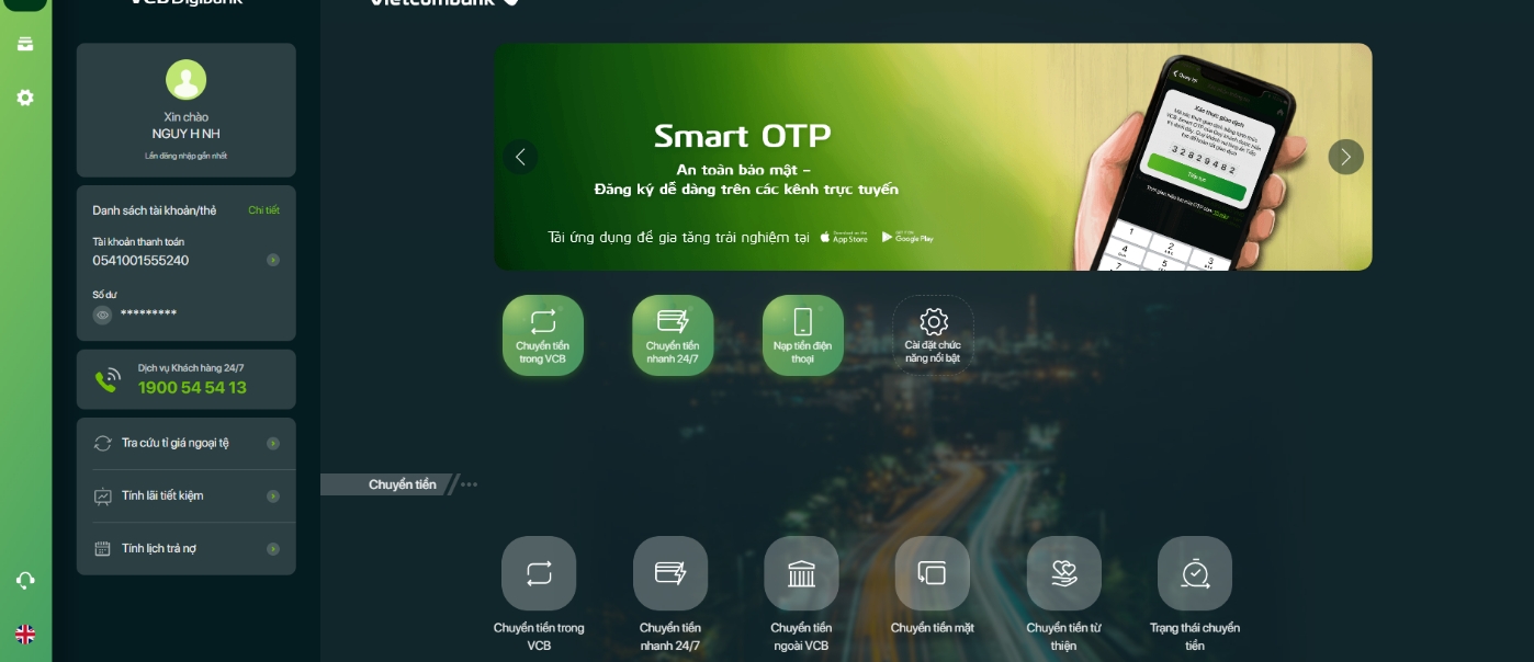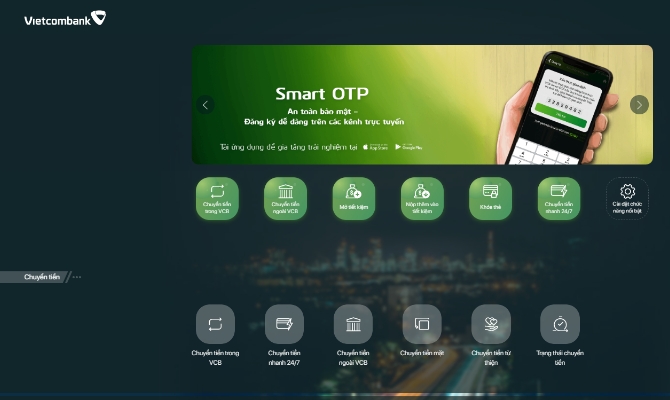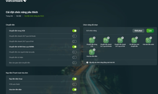 Mở website VCB Digibank, nhấn menu trái -> chọn Cài đặt chức năng nổi bật