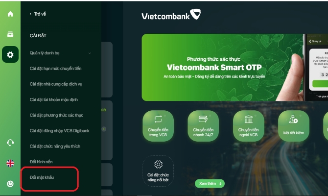 Mở website VCB Digibank, nhấn menu trái -> chọn Đổi mật khẩu