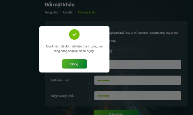 - Nhấn nút Đóng để thực hiện đăng nhập lại bằng mật khẩu mới.