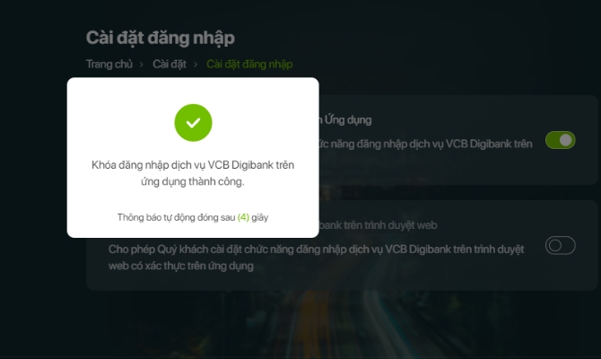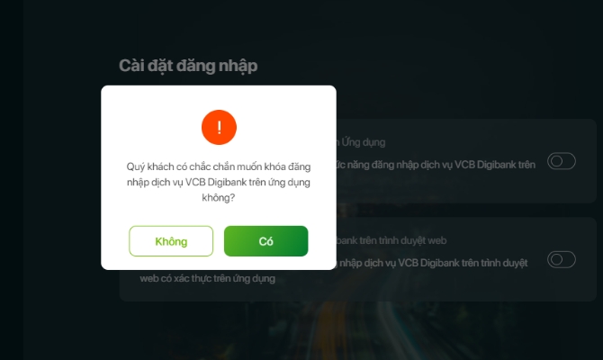 + Nhấn Có sẽ thực hiện khóa chức năng đăng nhập tài khoản VCB Digibank trên ứng dụng