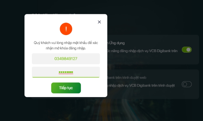 + Nhấn Có sẽ tiếp tục thực hiện mở khóa chức năng đăng nhập tài khoản VCB Digibank trên ứng dụng.