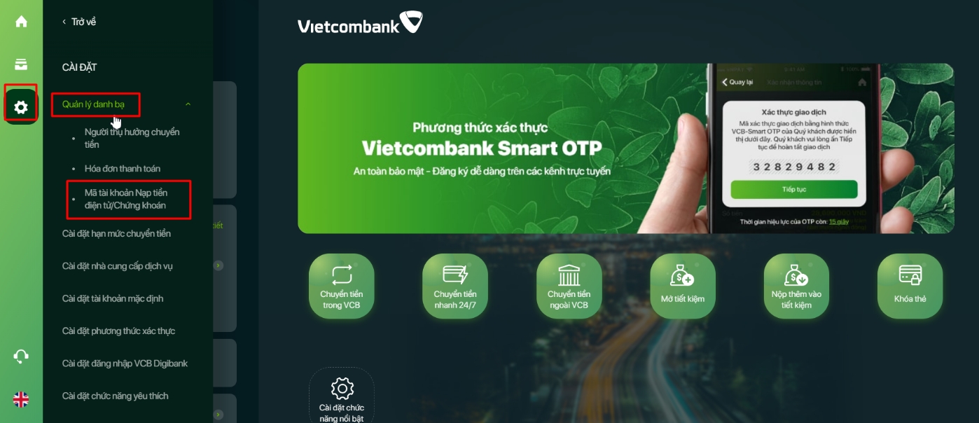 Tại màn hình chính, nhấn chọn menu Cài đặt -> chọn Quản lý danh bạ -> chọn Mã tài khoản nạp tiền điện tử/ Chứng khoán