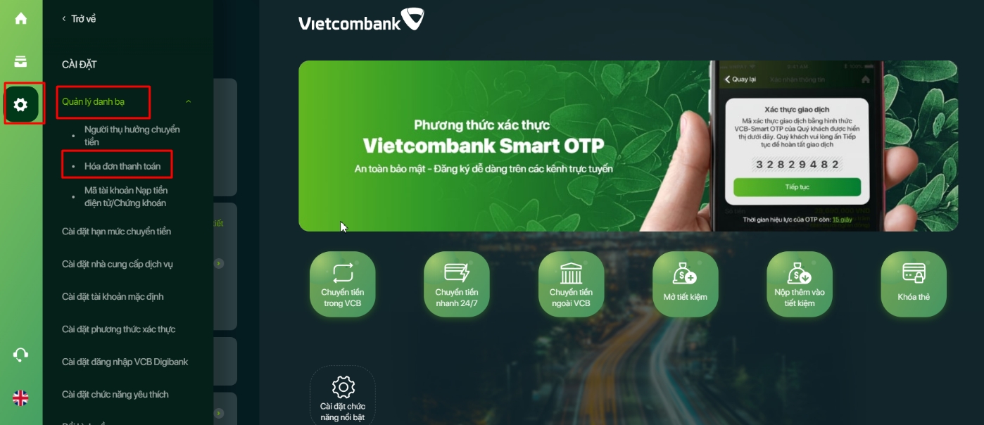 Tại màn hình chính, nhấn chọn menu Cài đặt -> chọn Quản lý danh bạ -> chọn Hóa đơn thanh toán