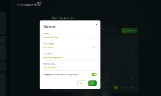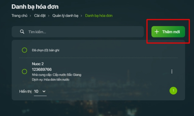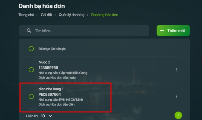 Tại màn hình danh sách danh bạ hóa đơn thanh toán