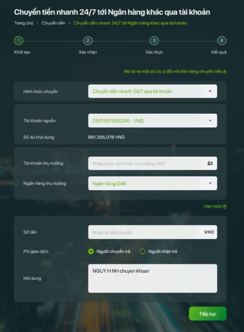 - Nhập nội dung chuyển tiền (Nếu KH không nhập, nội dung chuyển tiền hiển thị giá trị mặc định)