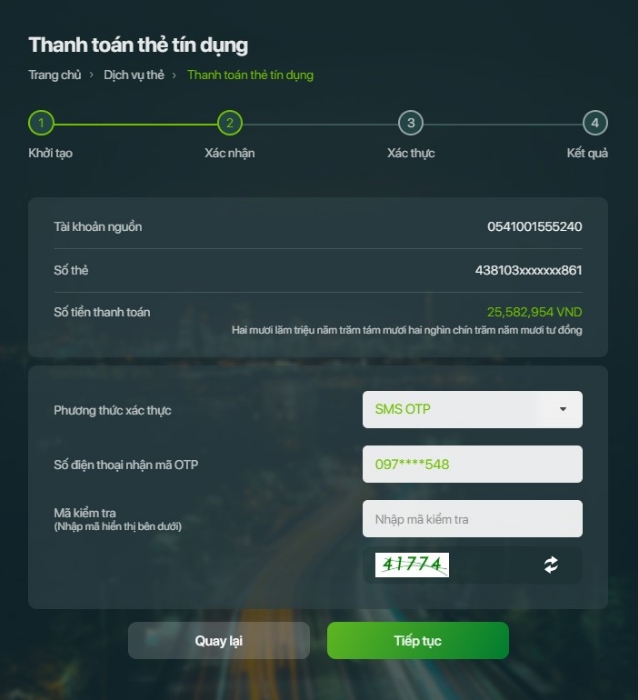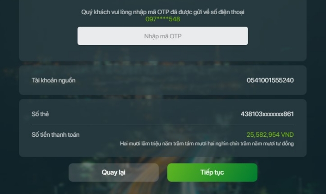 - Xác thực bằng SMS OTP: nhập mã OTP được gửi về số điện thoại của khách hàng