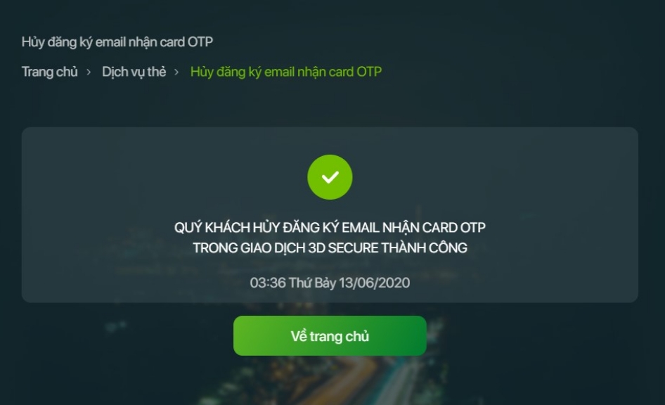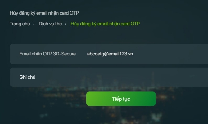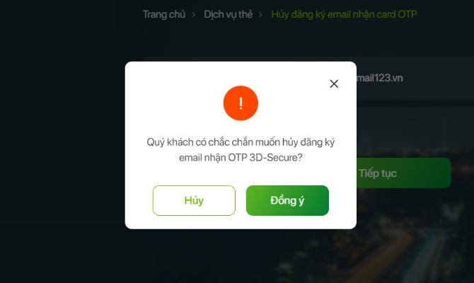 - Nhấn chọn Đồng ý: để xác nhận yêu cầu Hủy đăng ký email nhận card OTP