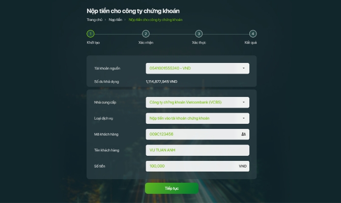 Tại màn hình khởi tạo -> nhập đúng và đủ thông tin cho các trường -> nhấn Tiếp tục