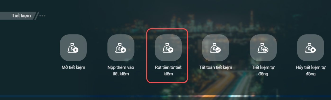 Tại màn hình chính chọn chức năng “Rút tiền từ tài khoản tiết kiệm”