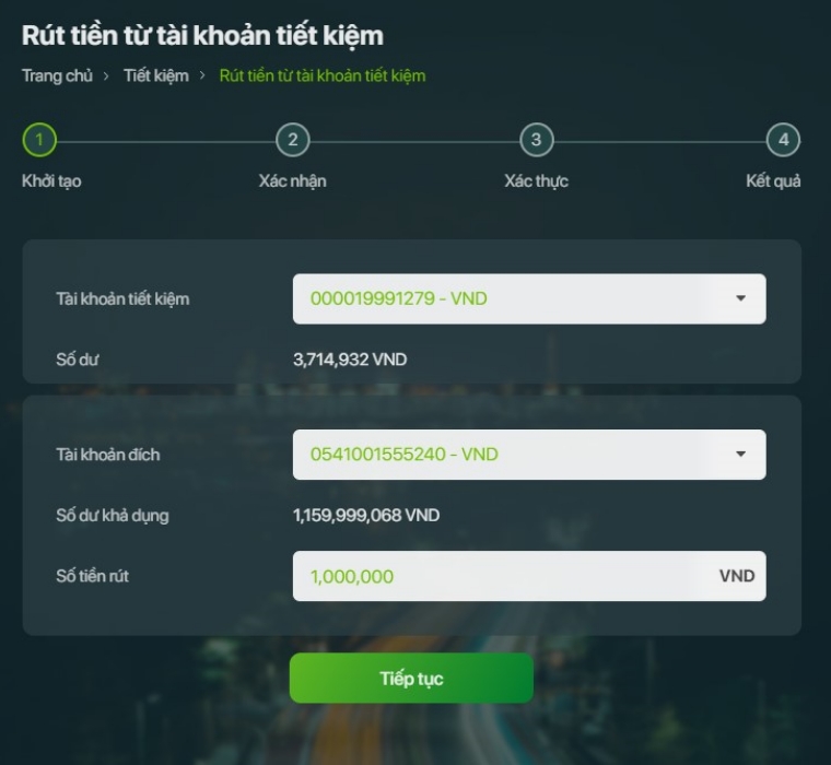 - Nhấn chọn tiếp tục để hoàn thành giao dịch