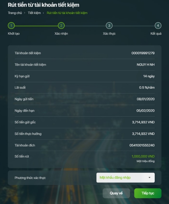 - Hiển thị thông tin của giao dịch vừa thực hiện: số tiền vừa rút, tài khoản tiết kiệm, mã giao dịch, số dư hiện tại.