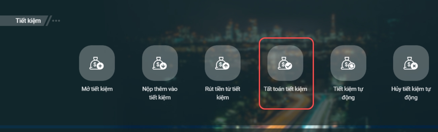 Tại màn hình chính chọn chức năng “Tất toán tài khoản tiết kiệm”
