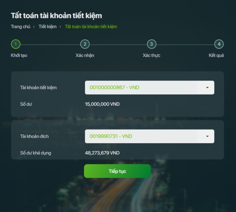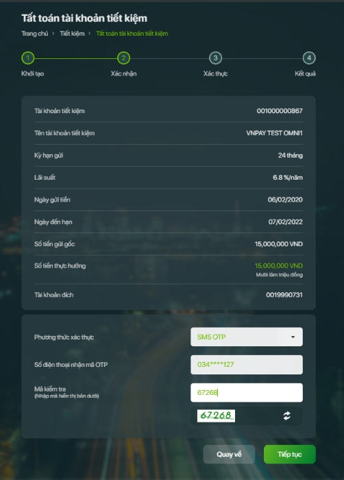 - Nhập và chọn thông tin để tất toán tiết kiệm