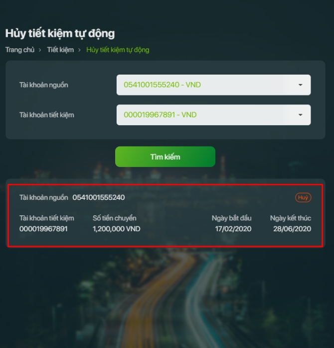 Giao dịch tiết kiêm tự động đã tạo thành công sẽ được hiển thị ở danh sách hủy tiết kiệm tự động